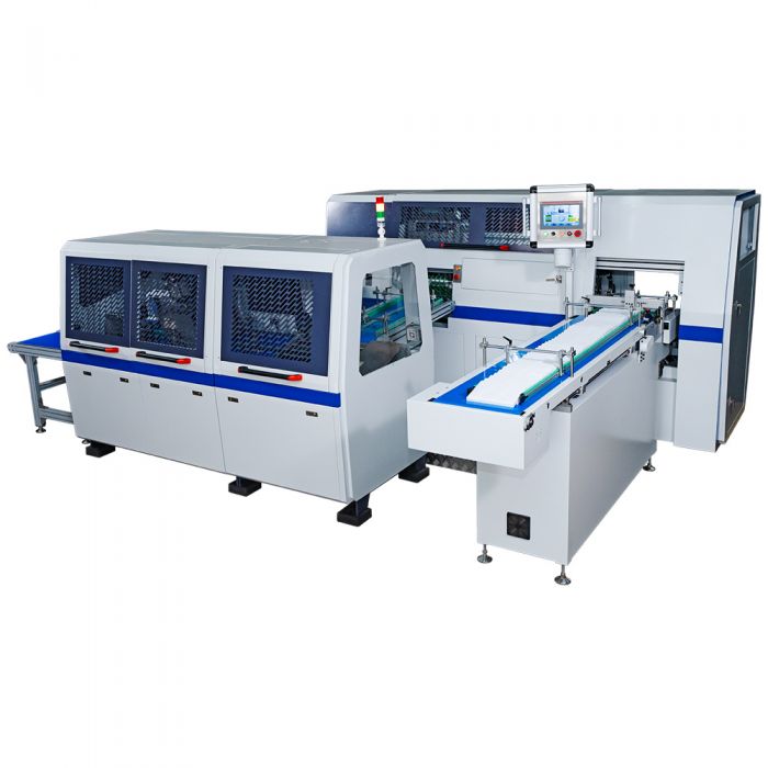 HDP CIM Digital Cover Casing-In Machine, adopting servo control, it can realize the whole machine automatic adjustment of book blocks and covers size in a short time, for changeover different jobs automaticlly. gluing, cover casing-in, joint forming, nipping and flat pressing, in one-time automatic completion. Controlled by touch screen or read the bar code, easy operation, patented cold gluing system, uniform glue application and saving glue, automatic book block feeding and separation function, accurate positioning for jointing, fast production speed, elegant appearance of hardcover books, and is high efficient equipment for the product